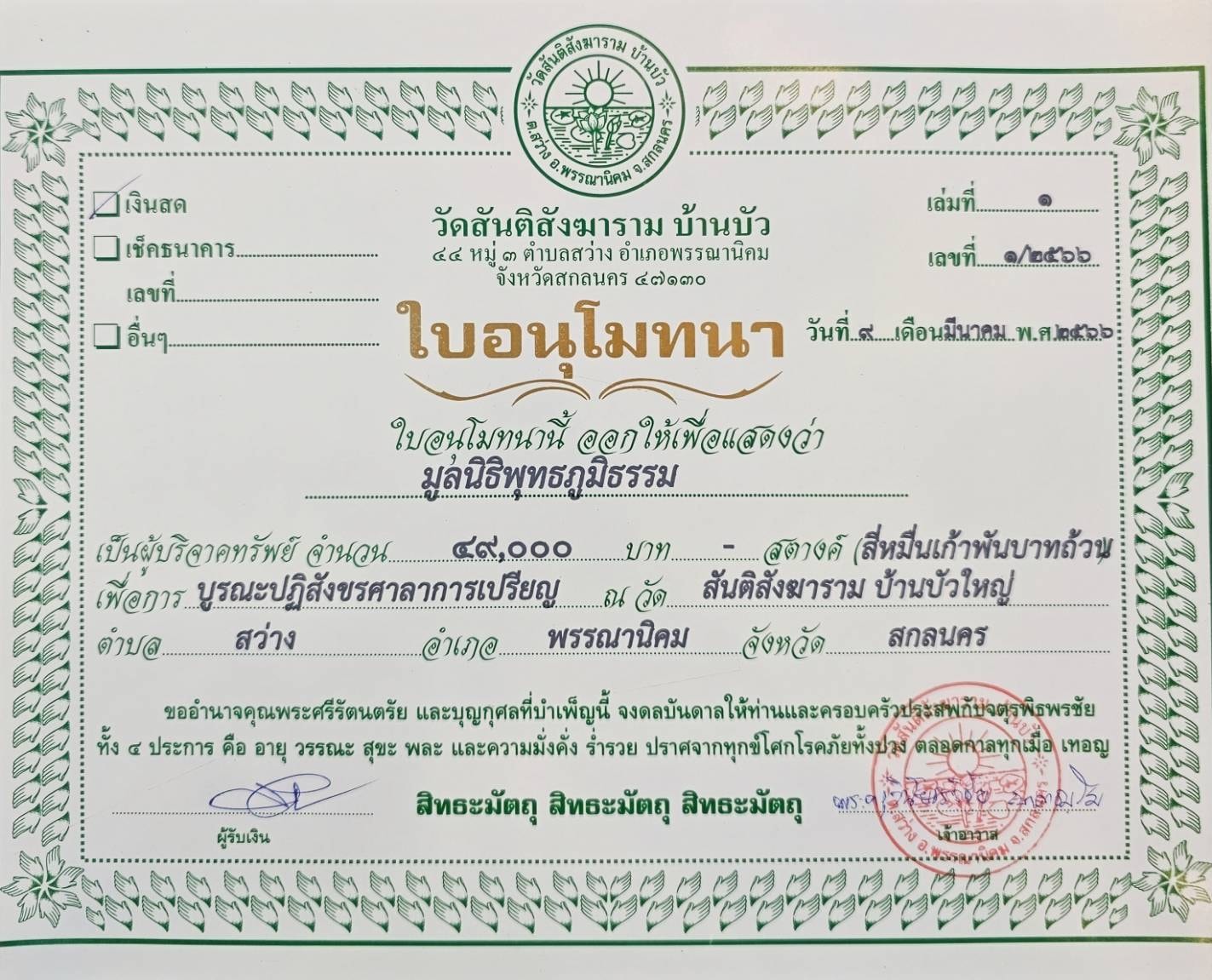 1. ร่วมถวายค่ารังวัดซื้อที่ดิน วัดป่าสันติสังฆาราม จ.สกลนคร ซึ่งเป็นวัดที่หลวงปู่สิม พุทธาจาโร เพื่อทำให้ที่ดินวัดสันติสังฆารามที่หลวงปู่สิมได้สร้าง สำเร็จลุล่วง