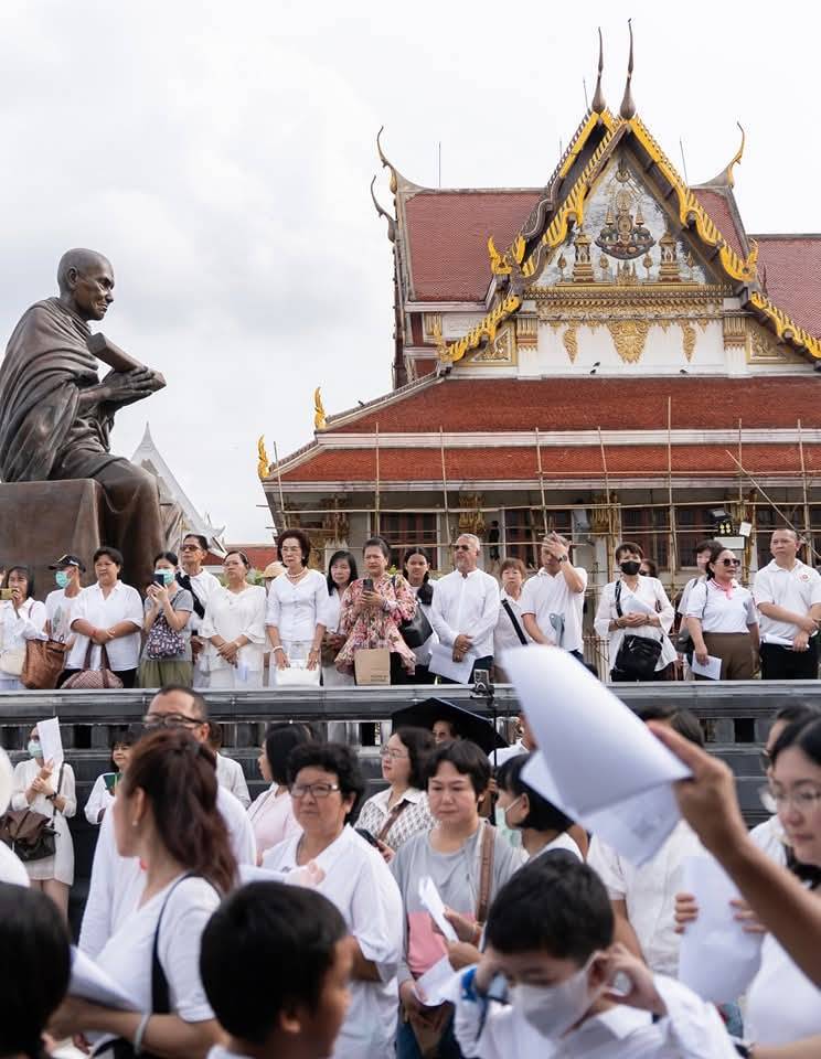 ตั้งใจ ผู้คนทยอยมากันไม่ขาดสายพร้อมรอยยิ้ม สีขาวของเสื้อผ้าที่ทุกคนสวมใส่สะท้อนแสงแดด