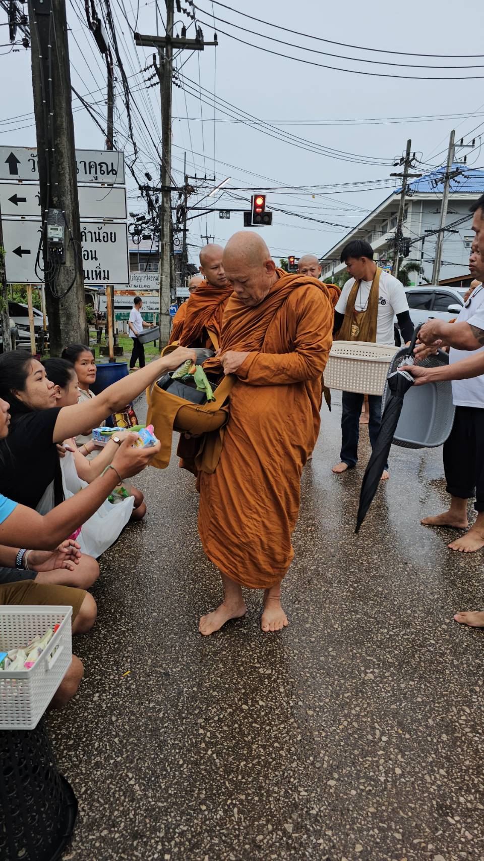 พุทธศาสนิกชนใส่บาตรท่ามกลางสายฝน ณ วัดป่าบ้านใหม่...