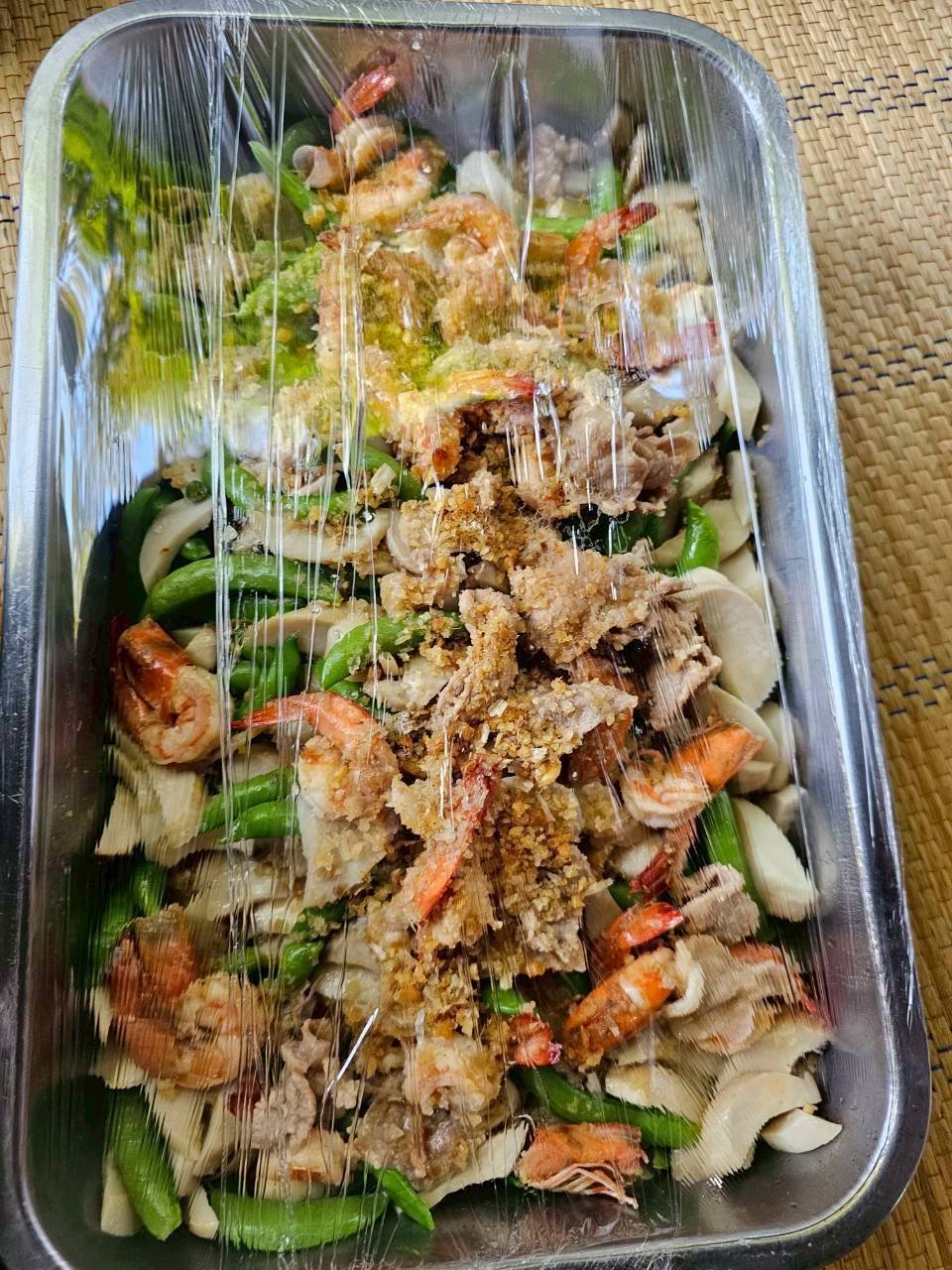 เค้กปีใหม่ ๕ ปอนด์ & ภัตตาหาร ๖ ถาด และใส่บาตรด้วยนม ขนม น้ำ